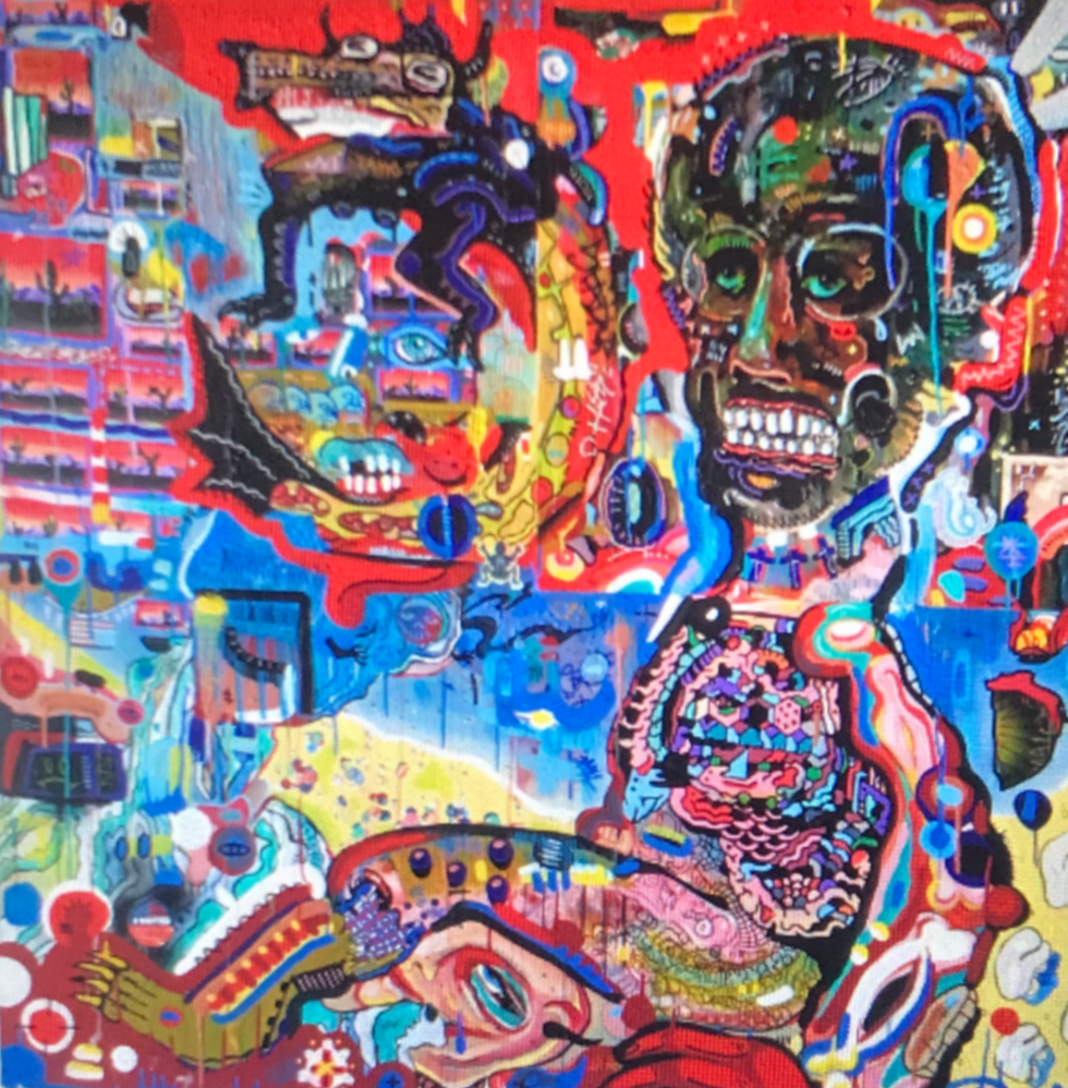 Growing up in the 90s and early 2000s Jesse drew a huge influence from the historic environment in which he lived along with radical pop culture of the time. Folk art lending a handmade charm and muted color pallets, mixed with electric color pallets of 90s and 2000s cartoons. His mother's love of small nick nacks that littered his childhood home influences his obsession with filling every space on his canvas and corrupting his characters with life forms and structural pieces meant to mimic and reimagine systems and life within ourselves.